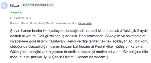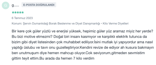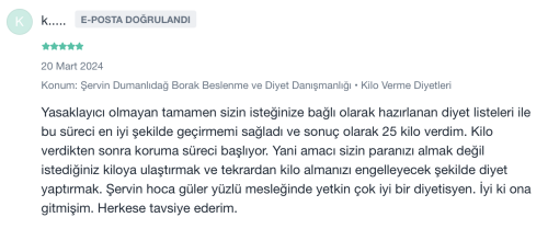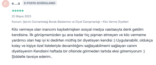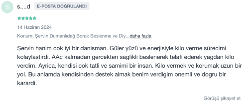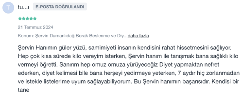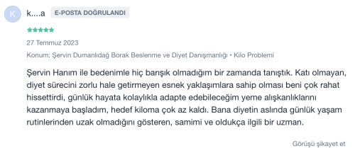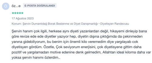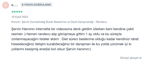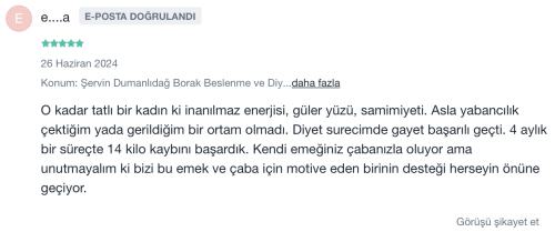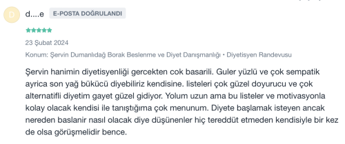 Şervin Dumanlıdağ Borak Beslenme ve Diyet Danışmanlığı, Ankara Çukurambar’da hizmet veren köklü bir merkez olarak, bireylerin yaşam tarzlarına ve ihtiyaçlarına uygun kişiselleştirilmiş beslenme programları oluşturarak sağlıklı kilo yönetimi, obezite, diyabet ve diğer beslenme bozuklukları konularında destek sunmaktadır. Çukurambar’daki merkezi aracılığıyla danışanlarına hem yüz yüze hem de online olarak geniş kapsamlı hizmet sağlayan bu merkez, beslenme biliminin en güncel yöntem ve yaklaşımlarını benimseyerek sağlıklı beslenme alışkanlıklarının kalıcı hale getirilmesini hedeflemektedir. 2016-2018 yılları arasında Özel Medova Hastanesi’nde, 2018-2022 yılları arasında ise İstanbul NP Beyin Hastanesi’nde görev yapan Şervin Dumanlıdağ Borak, şu anda danışmanlık merkezinde bireylerin sağlıklı yaşam hedeflerine ulaşmalarına yardımcı olmaktadır.